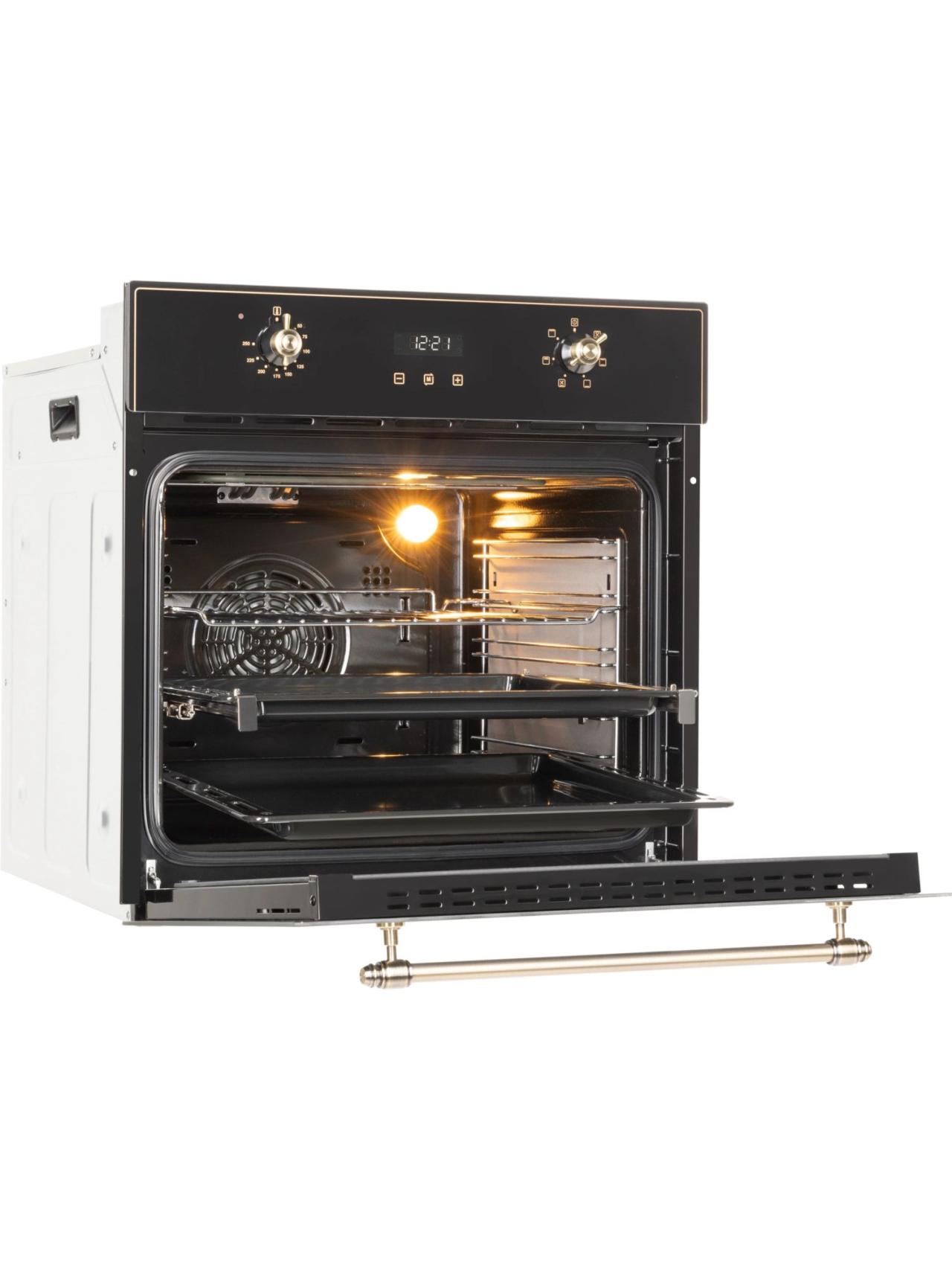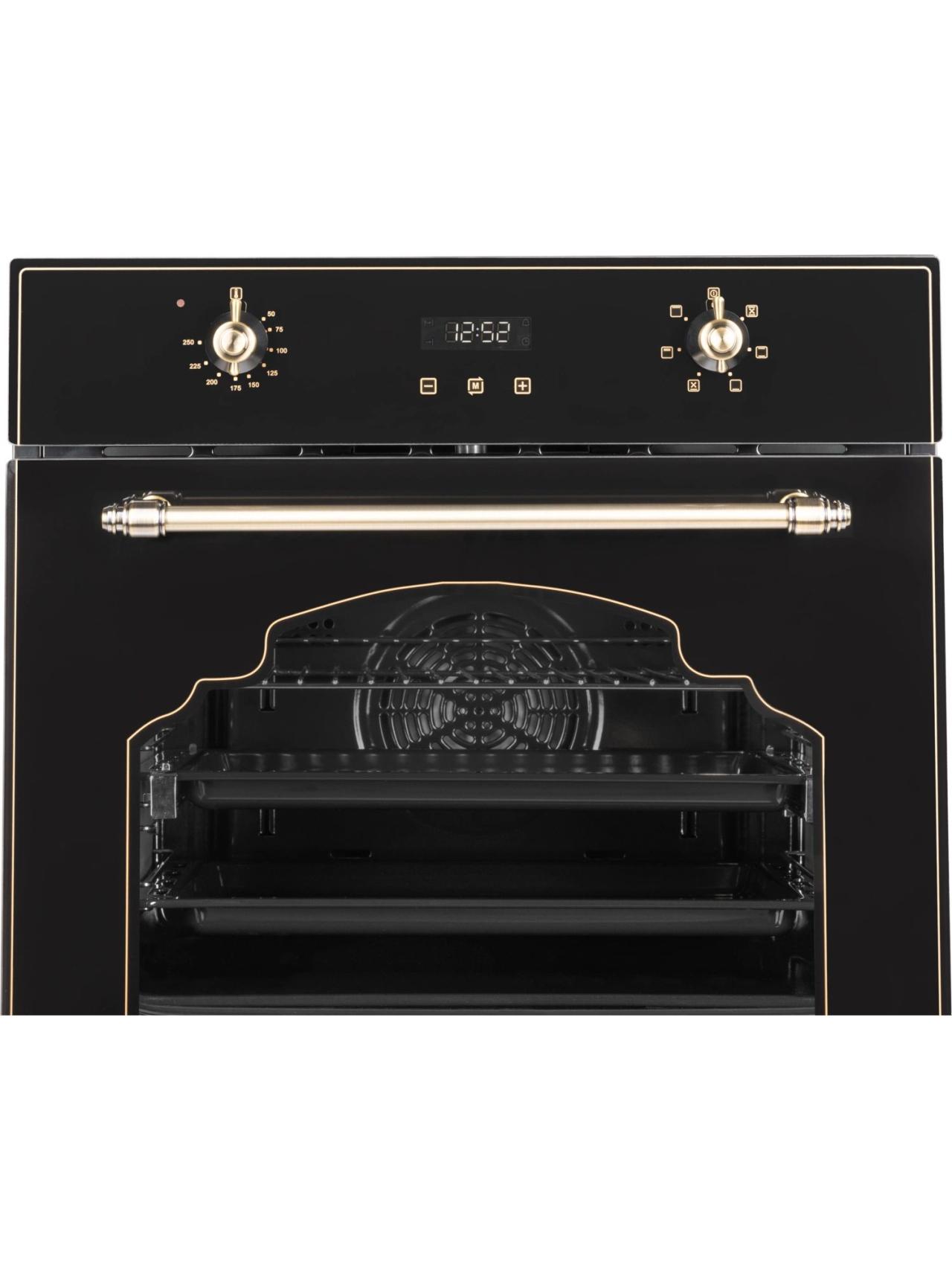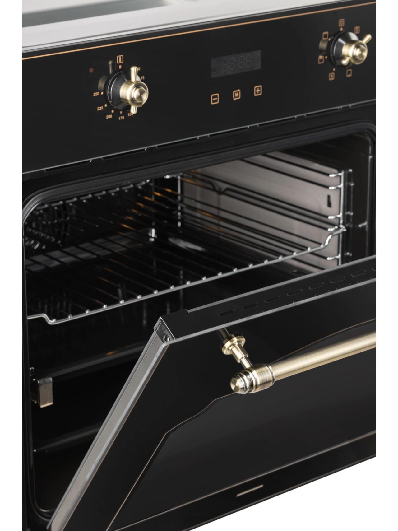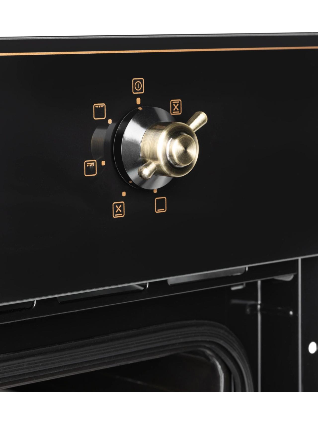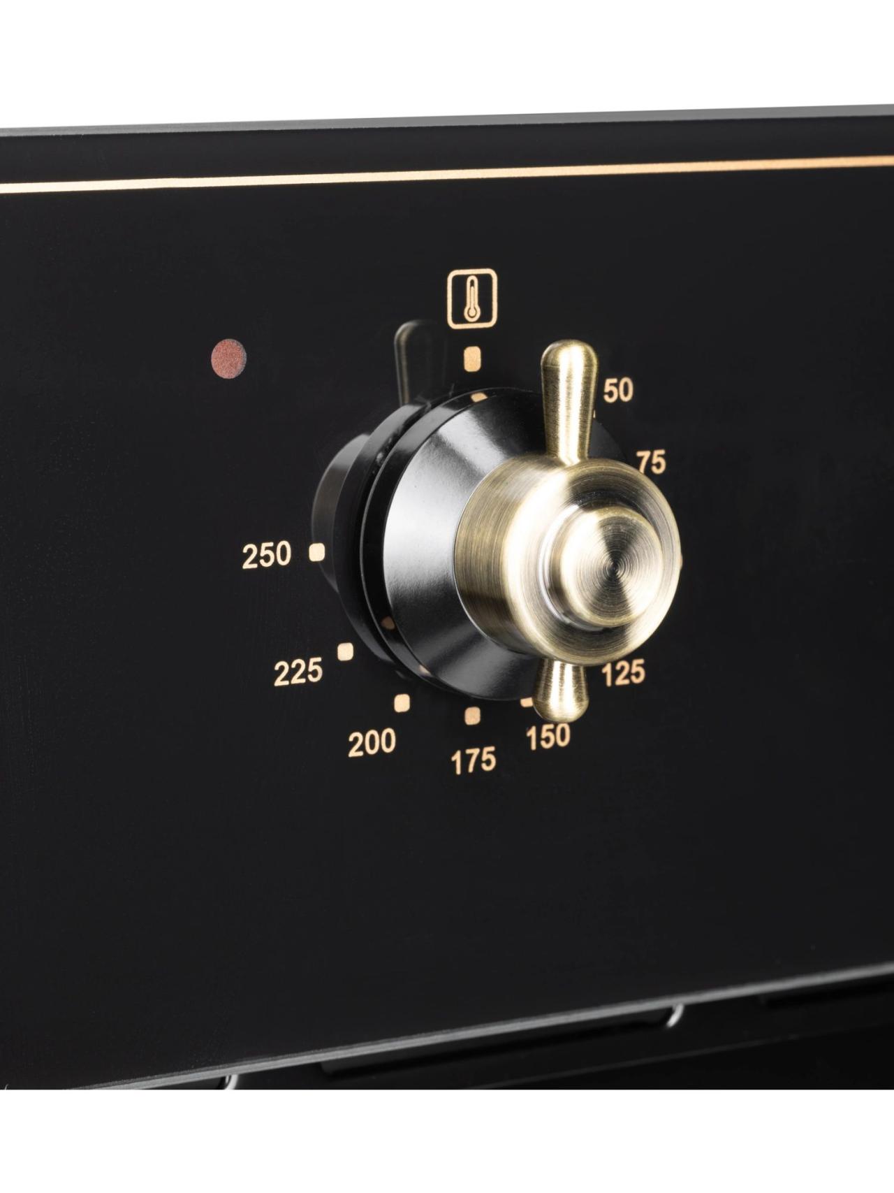 Ретромотив дизайнерского исполнения духовки позволит гармонично интегрировать технику в столовые гарнитуры в стиле классика, винтаж или прованс. Духовой шкаф черного цвета с электронной панелью управления украшен декоративными поворотными переключателями и металлической ручкой дверцы цвета состаренной латуни. Внимание к подобным деталям ясно подчеркивает художественные акценты пространства, создавая единую эстетическую атмосферу.