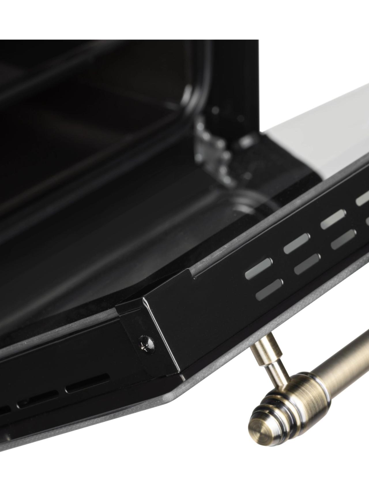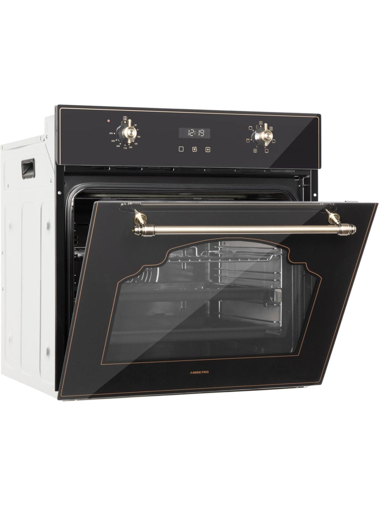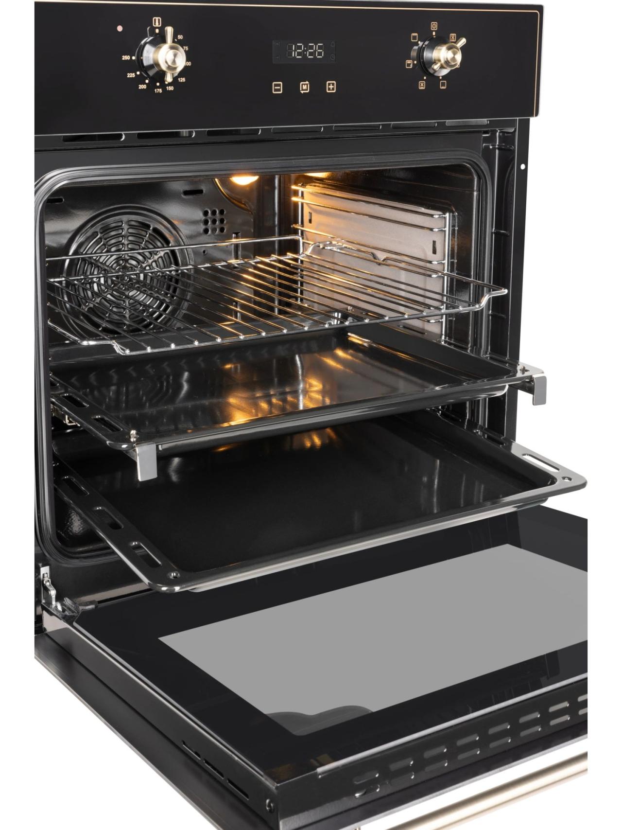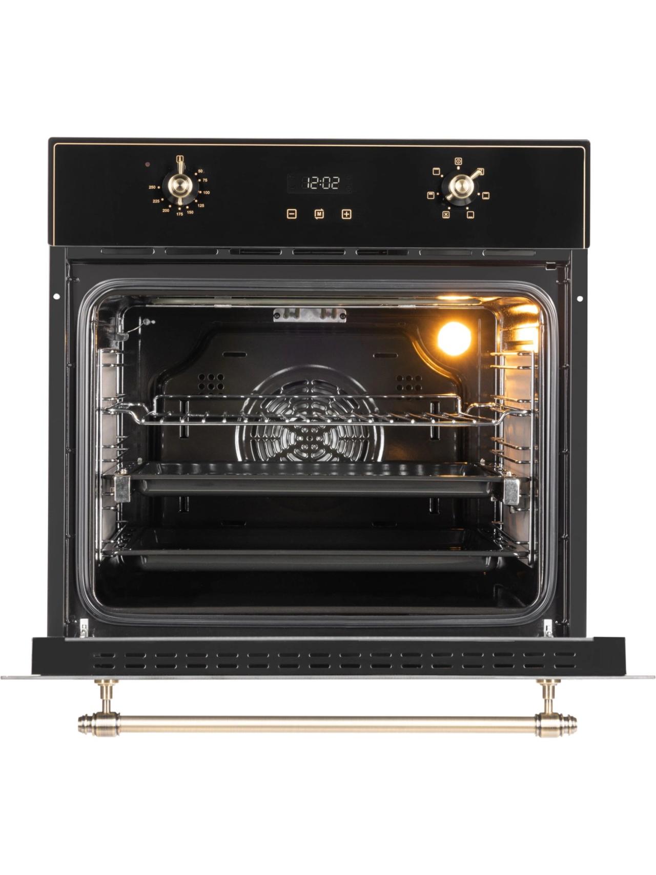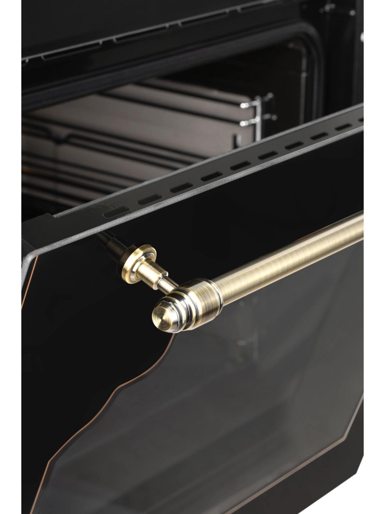 Ретромотив дизайнерского исполнения духовки позволит гармонично интегрировать технику в столовые гарнитуры в стиле классика, винтаж или прованс. Духовой шкаф черного цвета с электронной панелью управления украшен декоративными поворотными переключателями и металлической ручкой дверцы цвета состаренной латуни. Внимание к подобным деталям ясно подчеркивает художественные акценты пространства, создавая единую эстетическую атмосферу.