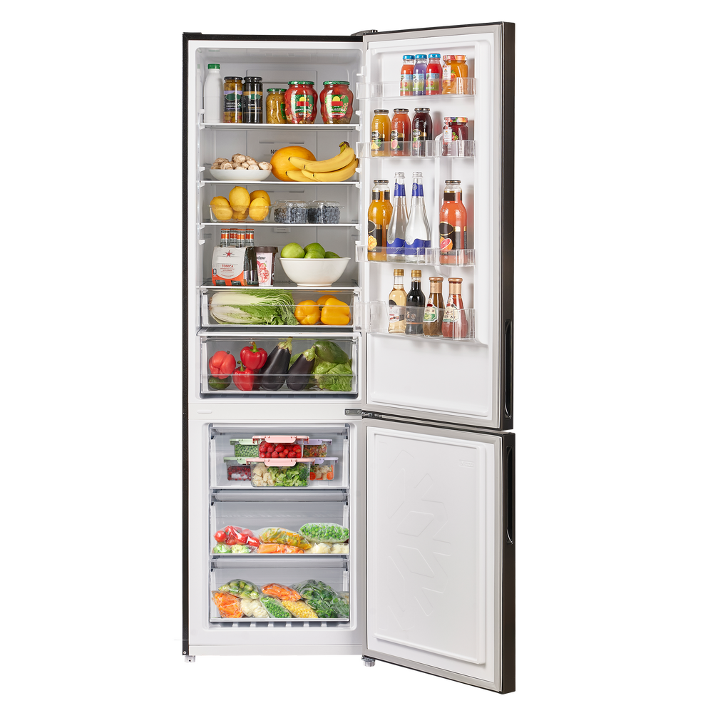 За равномерное распределение холода отвечает динамическое охлаждение: специальный вентилятор поддерживает оптимальные условия на каждой полке и в любом отделении. Внутреннее пространство продумано для гибкой настройки — высота полок и отсеков регулируется, полки выполнены из закаленного стекла, а комплектация включает подставку для яиц и форму для льда.