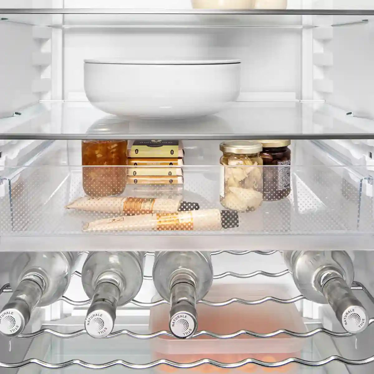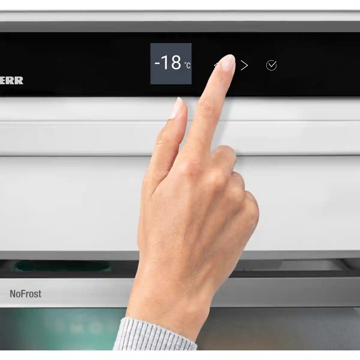 Ежедневное управление простое и точное: сенсорная панель позволяет задавать температуру в диапазоне от +2°C до +9°C, а серебристый стальной корпус с покрытием Antifingerprint дольше остаётся опрятным. Дверь с переставляемым упором поможет адаптировать установку под планировку кухни.