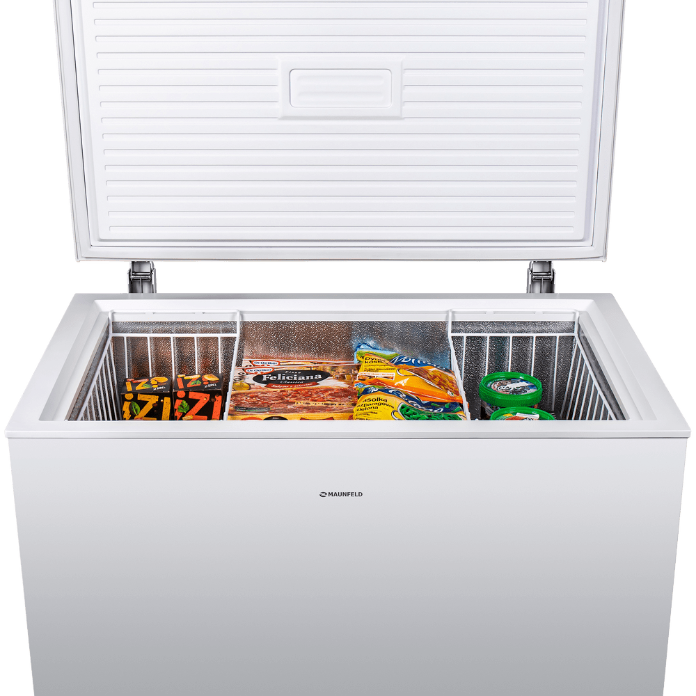 Морозильный ларь MAUNFELD MFL300W создан для тех, кто хочет хранить большой запас продуктов без переплаты за лишние функции. Это отдельностоящий однокамерный ларь белого цвета с прочным металлическим корпусом и внутренней отделкой из антибактериального пластика легкой очистки. Такой материал помогает поддерживать гигиену и порядок даже при частом использовании.