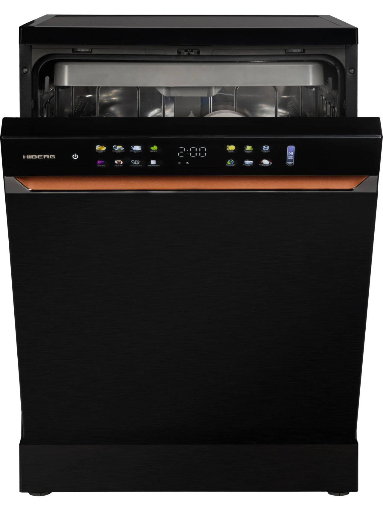 Для комфорта предусмотрены выбор зоны мытья (в одной корзине), таймер отсрочки, цветная сенсорная панель с большим дисплеем. Премиальный дизайн подчеркнут стильными кожаными вставками и единой стилистикой со стиральной машиной HIBERG I-DDQ10-814 B. За безопасность отвечают полная защита от протечек AquaStop и блокировка от детей. Гарантия — 2 года.