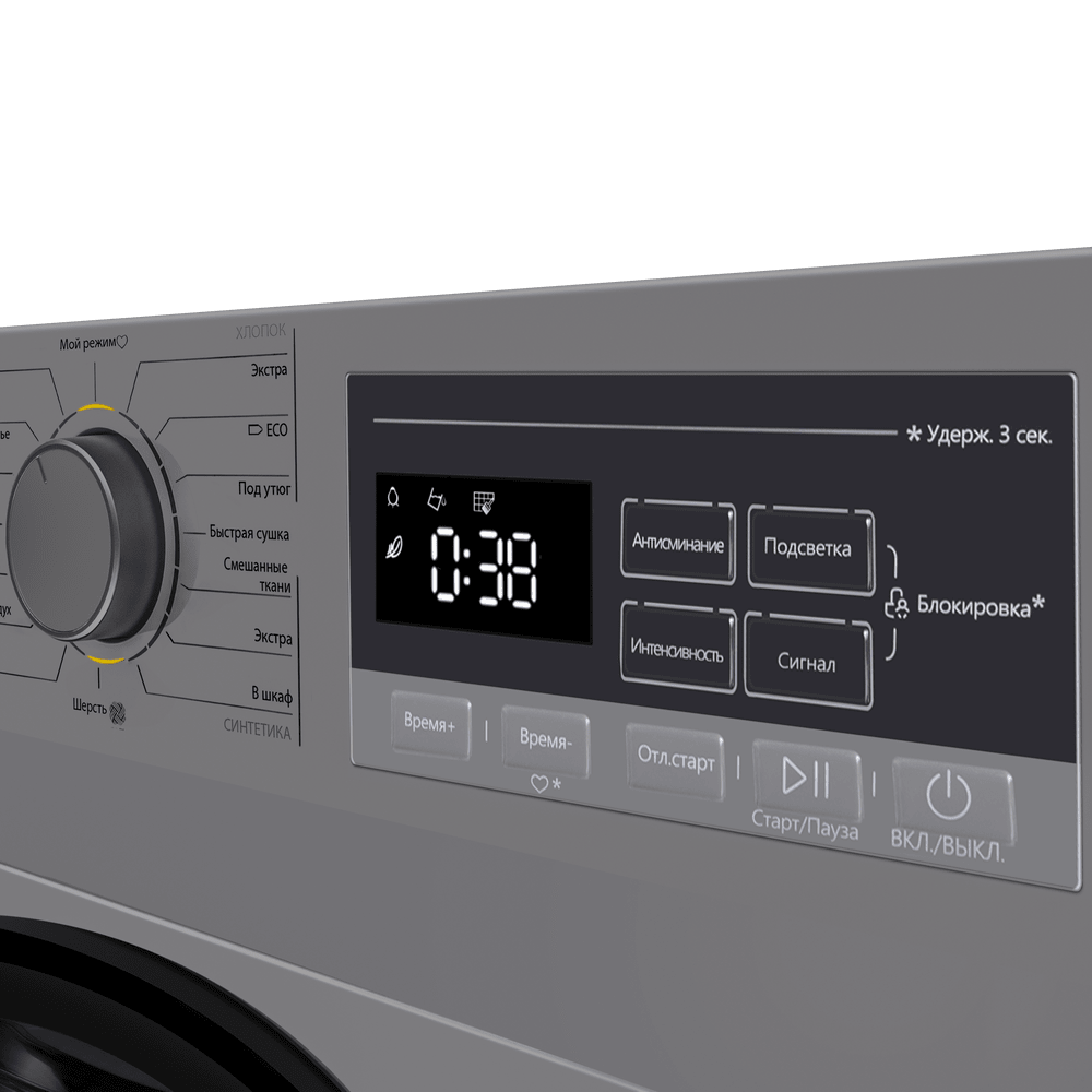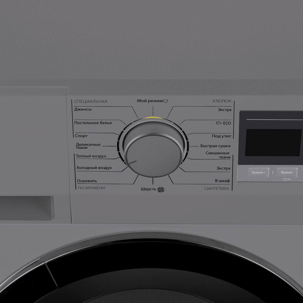 За комфорт и точность отвечает датчик влажности, который автоматически определяет степень влажности и подстраивает длительность цикла. Большой информативный дисплей позволяет отслеживать параметры, менять температуру и при необходимости сокращать время сушки, а функция «Отложенный старт» (до 24 часов) помогает планировать день.