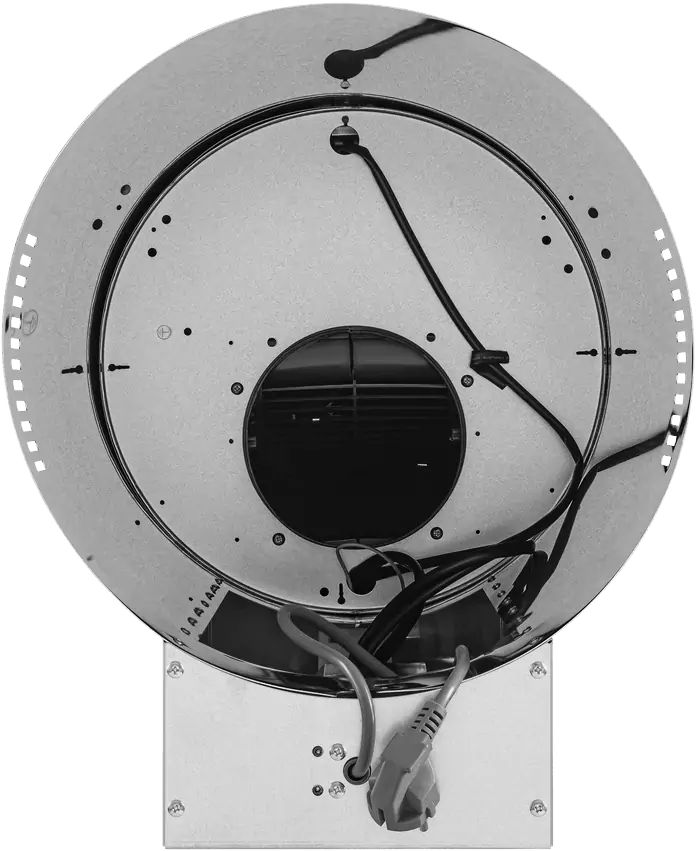 Корпус цилиндрической формы, выполненный из нержавеющей стали с термостойким покрытием, устанавливается на стену над поверхностью плиты. Алюминиевый многослойный жироулавливающий фильтр находится в нижнем торце вытяжки.